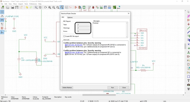 • Now after i connected, named all the components and put a flag on the disconnected pins i have preformed an electrical rules check by clicking on the symbol that is shown in the picture and you can see that there is no Errors :