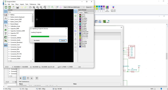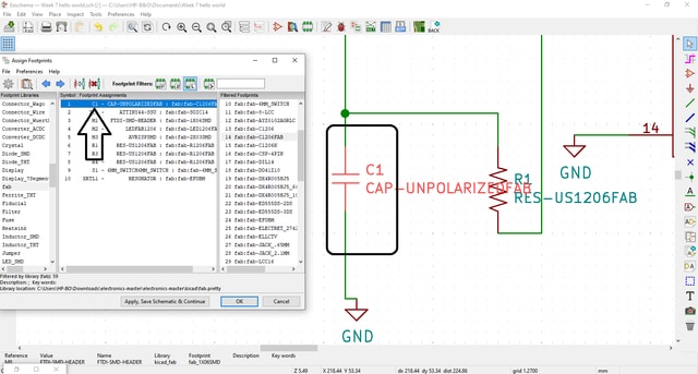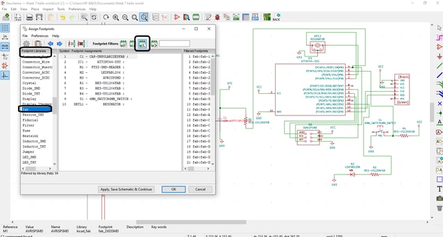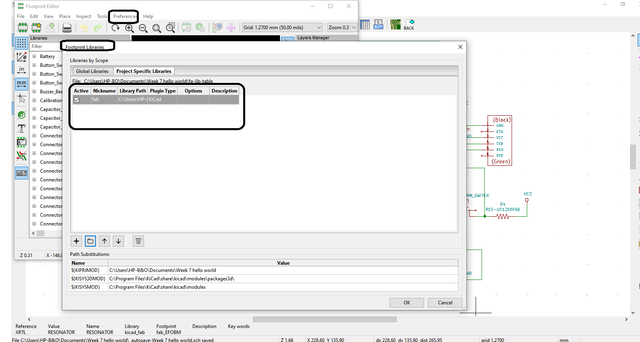 • Now after i have preformed the electrical rules check and made sure there is no errors i have assigned the PCB footprints to the schematic symbols and you can do that by clicking on the symbol shown in the picture and going to >> Footprint editor >> Footprint libraries >> add library, and here is a look :
