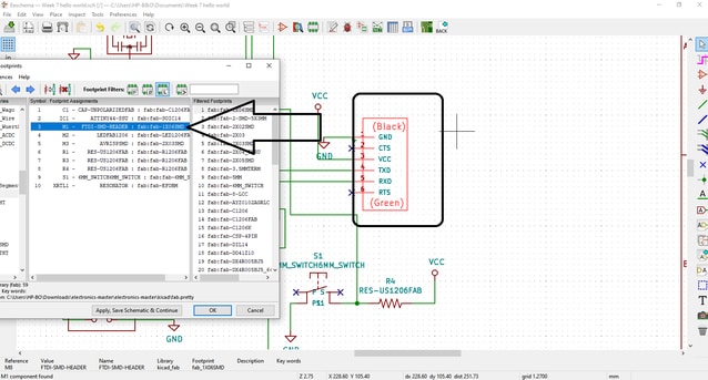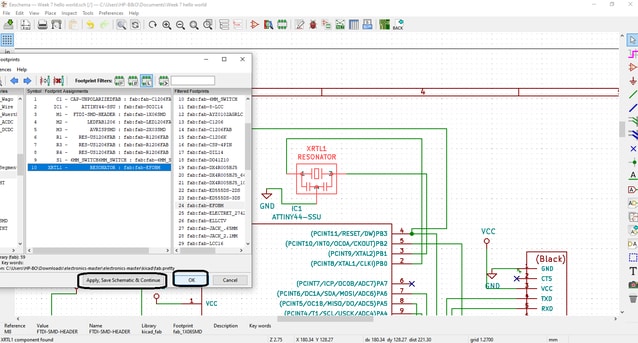 • Finally after checking and making sure i have add all the footprints and all the electrical rules are correct and there is no errors we click on >> Apply save schematic and continue >> ok, as you can see in picture :