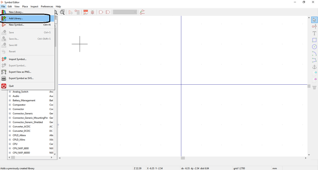 • Now you have to added the library “Fab Kicad library” and its not like “EasyEDA” once you added it you can use directly so no need to added the components, and you in order to added the library by going to >> symbol editor >> add library like this :