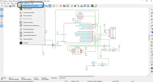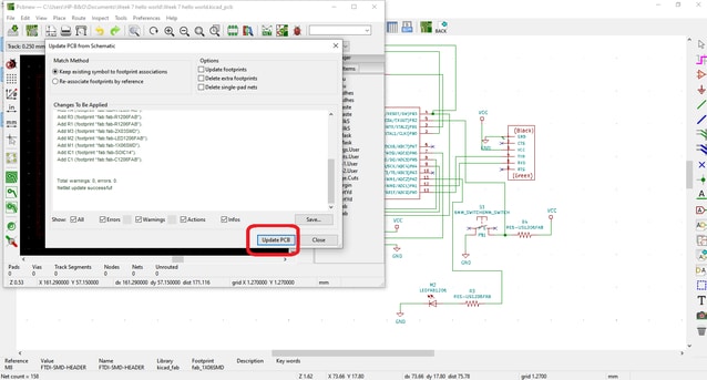 • Now we are ready to update PCB from schematic and you can do that by clicking on >> tools >> update PCB from schematic, and then click on Update PCB after ticking “Keep existing symbol to footprint associations as shown in the pictures :