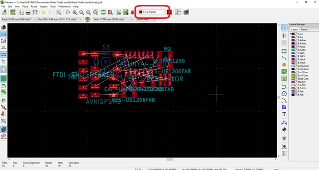 • Here you can see that we are ready to start designing our board and connecting the components but first you have to make sure you working on the correct layer which is the top “copper” layer as shown :