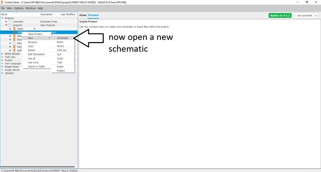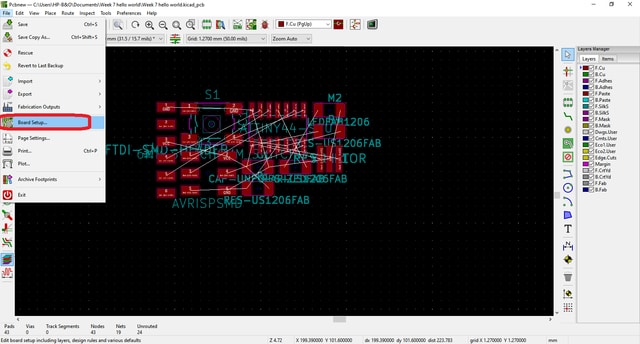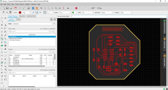 • Third i used EAGLE which i have used before but i wanted to learn more and more about this software and here is the process while designing the “Hello world” board :