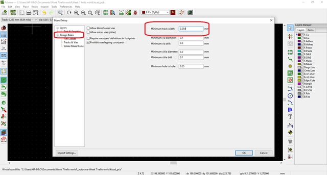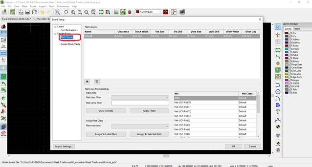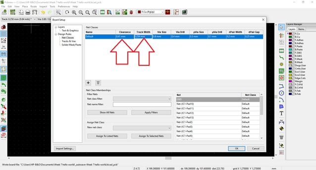 • Before starting to connect the components you have to set up the right settings and to do that you click on >> tools >> board set up, and then a window will appear, from this window click on “Net classes” and from there you have to edit the clearance and the track width also the dpair width must be equal to the track width , then you click on Design rules in order to change the Minimum track width as you can see in pictures :