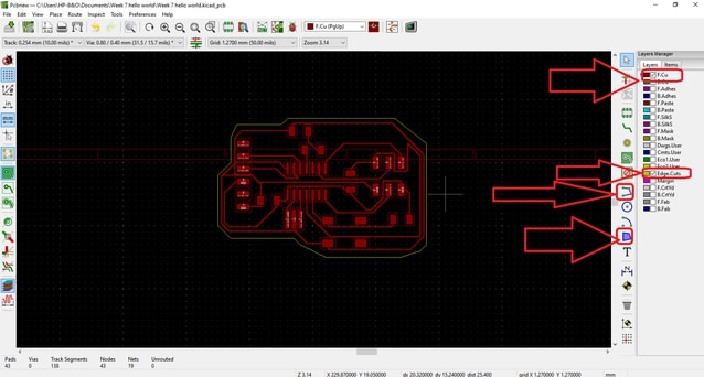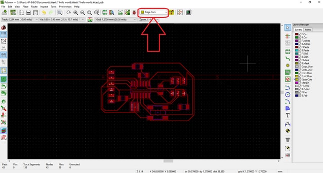 • Here after finishing the connections “traces” you change the layer to “edge layer” in order to make the outline “interior”, after drawing the edge line you have to hide all the layers except for the “edge layer” and the top layer “copper” like this :