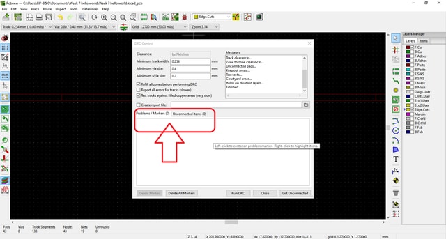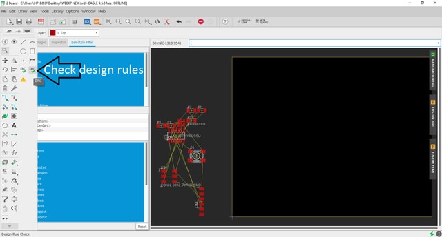• After finishing all the connections you have to make a “Design rule check” by clicking on the symbol shown in the picture and then running the check by clicking on the button “RUN DRC”, after running the check the software will tell you if you have any Errors and for there were no errors as shown in the pictures :