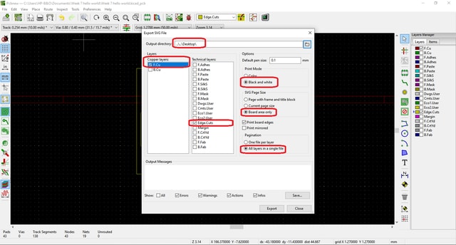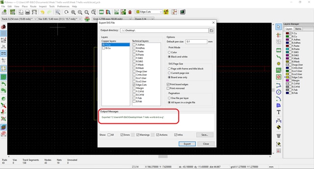 • Now we are ready to export the design as a “SVG” and you can do that by clicking on >> file >> export >> SVG, then a window will appear, in this window you have to put a direction for the design to be saved on, you have to put the layers that you have used and in our case its the top copper layer “F.CU”, the print mode on “Black and white”, SVG Page size to “Board area only” and the Pagination to “All layers to a single file” and then you click on export and a confirmation message will appear to confirm the exportation, and here is a look to this process :