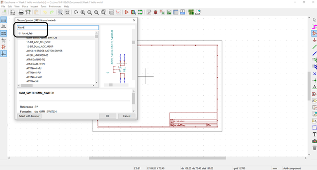 • This is the schematic window where you place the components and connect them, to do that you click on add part on the top right and you look for the library you want to use and its “Kicad fab library” in our case then you search for the components and add them also to make sure you have chosen the right component there is a symbol on the right of the library window like this :