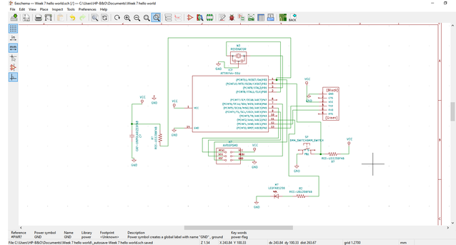 • Second i used Kicad because also i never used it so i wanted to learn everything about it and here is the process while designing the “Hello world” board :