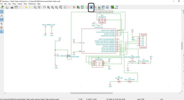 For the individual assignment i have to to redraw an echo hello-world board, add (at least) a button and LED (with current-limiting resistor) check the design rules, make it, and test it