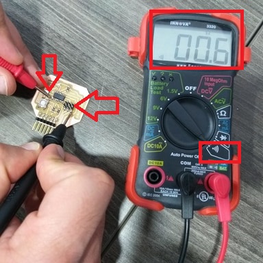 • First we started measuring the continuity between the GND pins of the ATtiny44, ISP header and FTDI header. The digital multimeter should beep and read almost around 0 Ohm and this means all of the three pins are connected and here is a look :