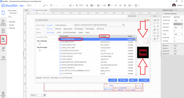 • Now you are ready to added the components you need and in my case i have made a table for the components i need for this week assignment, you can added a component by going to libraries and then search for the component you need and then click on place, i have found this feature in this software very useful that you can search by the component name or by filtering the libraries you have also when you click on the component name and you were not sure if this is the right one the software shows you a picture of how it will look on the board like this :