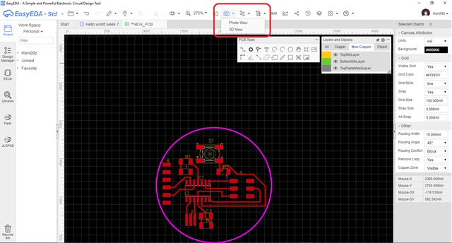 • Now after converting into PCB i have placed the components and connected them, then i have checked if there is anything wrong by checking the schematics again and viewing the PCB as Photo and 3D which considers to be a useful way in this software like this :