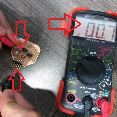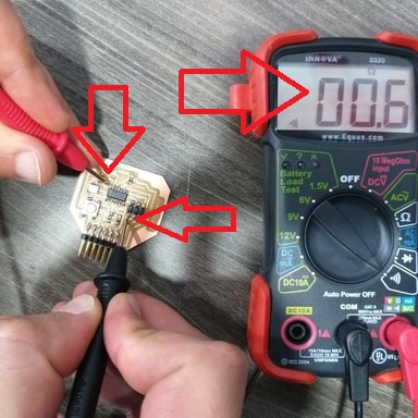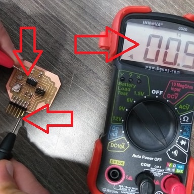 • Last we connected the board to the FabTiny programmer and then to USB. We measured the voltage between the VCC pin and GND pin. The digital multimeter read 5V, which is the USB port voltage.