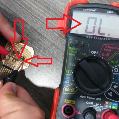 • Third we measured the continuity between the VCC pin and GND pin. The digital multimeter should not beep and read OL (Overload). This means there is no connection (short circuit) between the VCC and GND and here is a look :