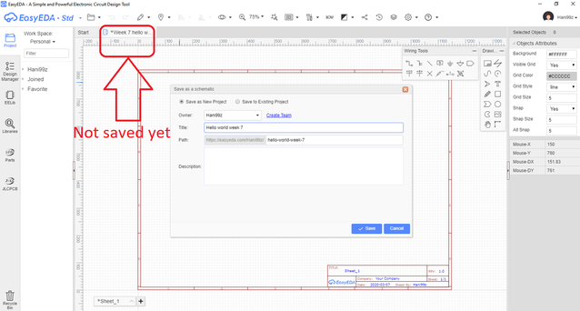 • Then you open a new schematic in order to start adding the components but before that you have to save the new schematic also as the previous step with a title and a brief description like this :