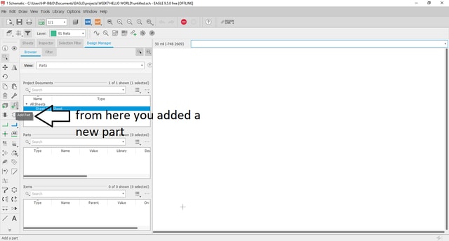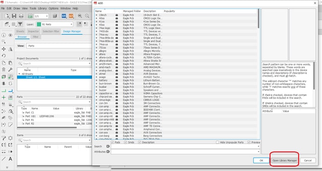 • In this window you can added parts from the symbol “added part” as shown in the picture but first you have to download the library “fab library”, which you can find on top, in order to do that click on add part and then go to “library manager” and then go to “available” and browse for the library you have downloaded and click on “use” and here is a look on how to do it :
