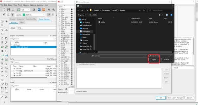 • Before adding any component you have to download the “Fab library” and you can do that by going to >> file >> Open >> EAGLE and that will open the “Fab eagle library” like this :