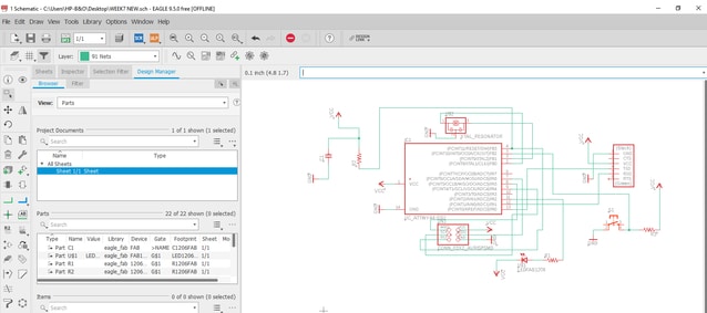 • Here after i have chosen the components i need i started to connect them copying “Neils board”, also i have added “LED” and button, and when i finished the schematics i have converted the schematic into board PCB like this :