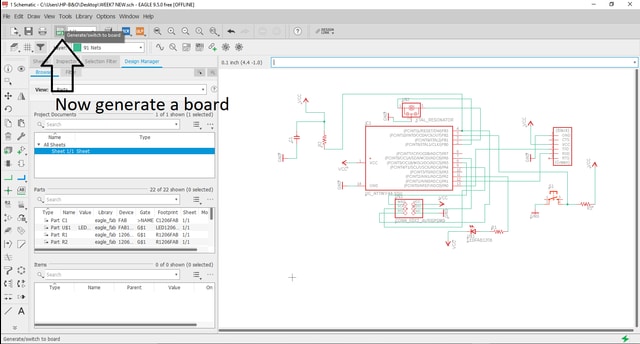 • After finishing the schematic now you can generate a board and to do that click on the symbol shown in the picture like this :