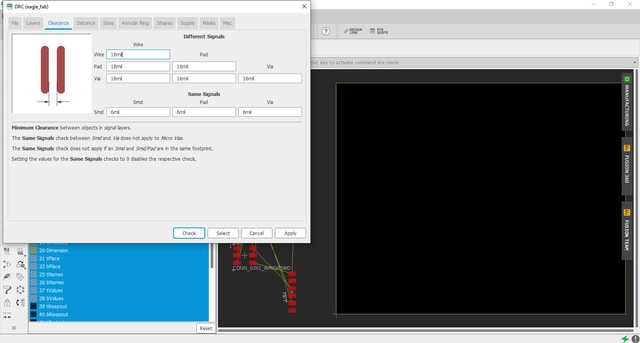 • This window will appear when you click on generate a board but before doing any routing you have to upload the “Design rules check” in order to make sure that all of your connections are right and to do that you click on the symbol” “DRC” and then click on apply, when you finish all your connections you go back to “DRC” And click on check in order to see if there is any errors like this :