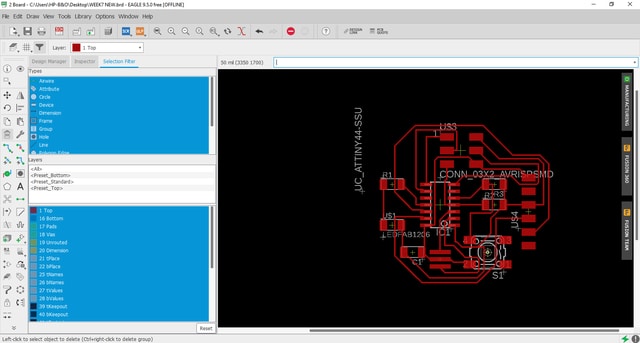 • Finding this error took me three days and at first i thought the problem is with the solder or that i have placed the components in a wrong way or the problem was from my ISP programmer but tracking these thoughts one by one i have reached to the main problem which was that i have forgot to check the design rules and the board was not programmed .