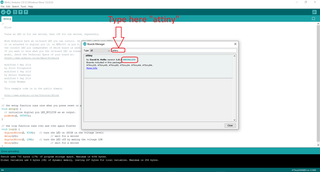 - This window will appear as shown in the picture and type “Attiny“ and click on install :