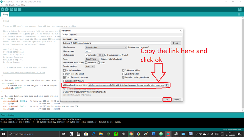 https://raw.githubusercontent.com/damellis/attiny/ide-1.6.x-boards-manager/package_damellis_attiny_index.jsonand paste it in “Additional board manager URLs” as shown in the picture :