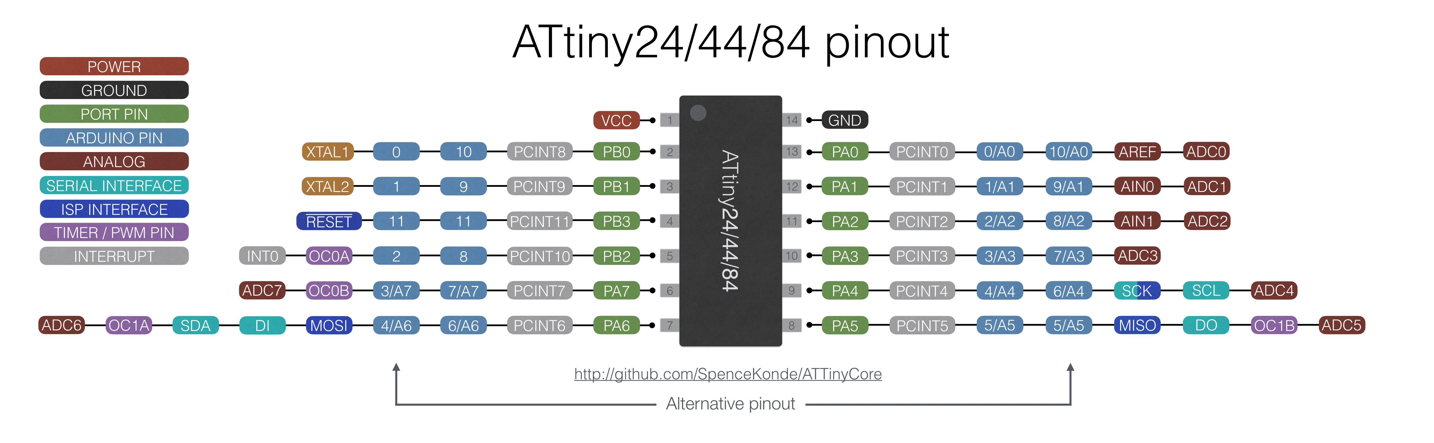 | CKSEL | The AMTEL Attiny44A can use several clock sources. By default, the clock used is the internal 8MHz oscillator. The available configurations can be found in the datasheet, in table 6-1. | 0010 | LOW | (3…0) | 25 |