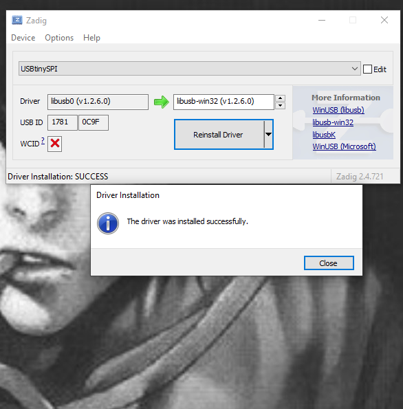 - After that you have to download drivers for your Programmer and to do that just Click here then when its successfully downloaded connect your programmer and go to Options >> List All Devices then Select “USBtinySPI” from the dropdown list and select “libusb-win32 (v1.2.6.0)” in the target driver side then Click on “Install Driver” and here is a look :