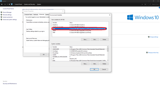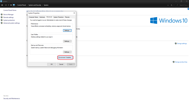 and to do that from Start menu and open the Control Panel, then go to System. From the left pane, choose “Advanced System Settings”. Under the Advanced tab, click the “Environment Variables” button and here is a look on how to do it :