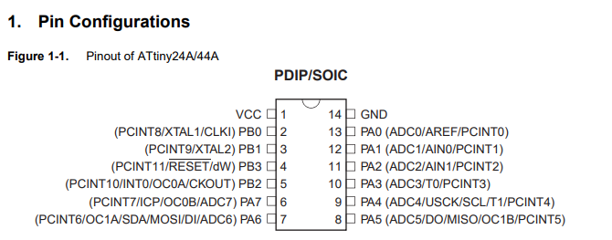 - Here you can see the Pin configurations and the Pin descriptions of the ATtiny44 :