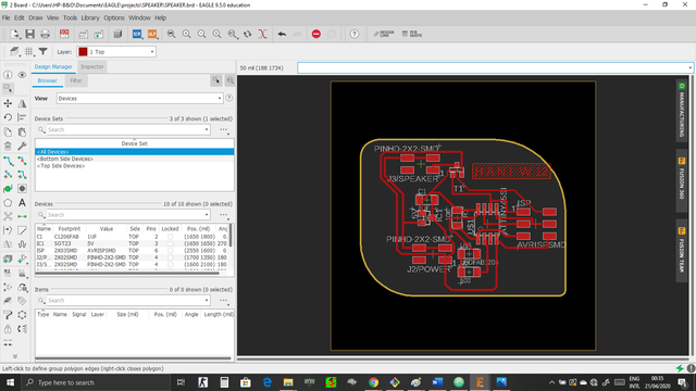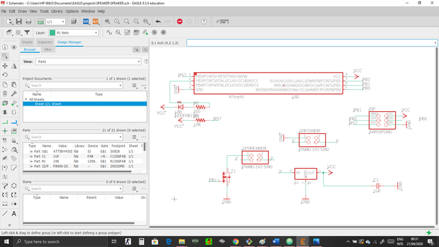 First i started to read about Speakers and here is the Datasheet of the speaker i am going to use, also i have added LED to my board to see if the board is working before programming the speaker board, and as i said all the boards will be designed using EAGLE so here is the process :