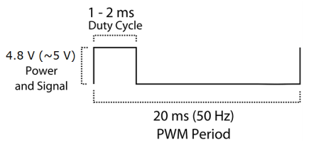 - From the picture we can understand that the PWM signal produced should have a frequency of 50Hz that is the PWM period should be 20ms. Out of which the On-Time can vary from 1ms to 2ms. So when the on-time is 1ms the motor will be in 0° and when 1.5ms the motor will be 90°, similarly when it is 2ms it will be 180°. So, by varying the on-time from 1ms to 2ms the motor can be controlled from 0° to 180°