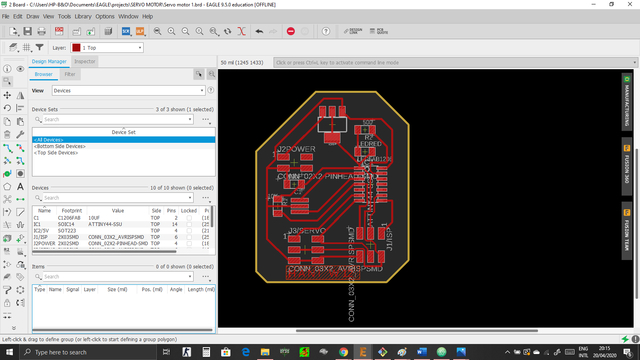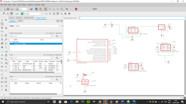 - First i started to read about the Servo motors and here is the Datasheet of the Servo motor i am going to use, also i have added LED to my board to see if the board is working before programming the servo motor board, and as i said all the boards will be designed using EAGLE so here is the process :