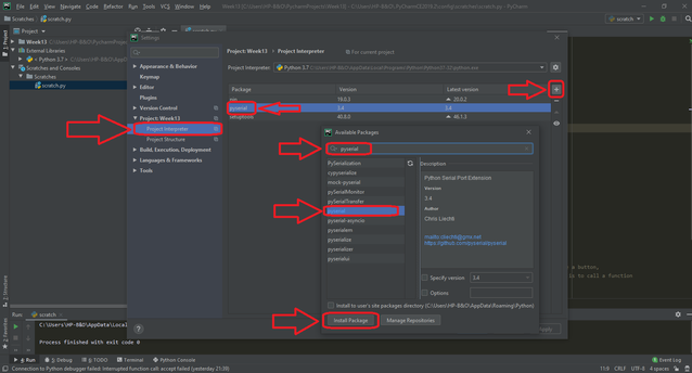Here is how to added the library, first click on settings >> project interrupter >> The + sign >> Type in search “Pyserial” >> Choose Pyserial Library >> Install package, and you are ready to go :