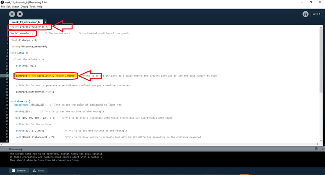 - Here you can see that you also have to added the “Port number”, “Baud number” and the “serial begin” in processing :