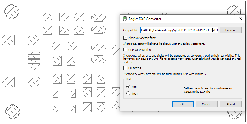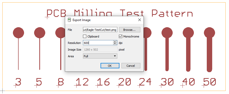 To work in Fabmodules tools I need export the PCB design in monochrome image and high resolution, so I use the follonig parameters in export option in Autodesk Eagle: