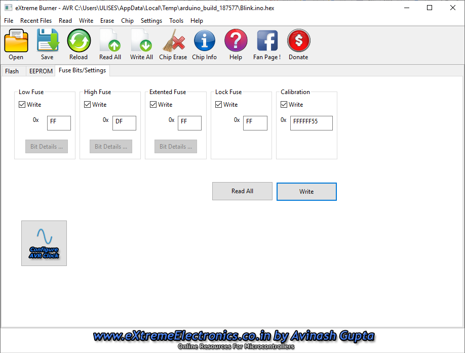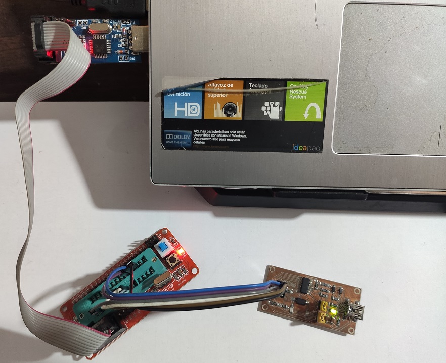 So I program the microcontroller, I click in Write -> All menu, and the programa detects and programs the chip: