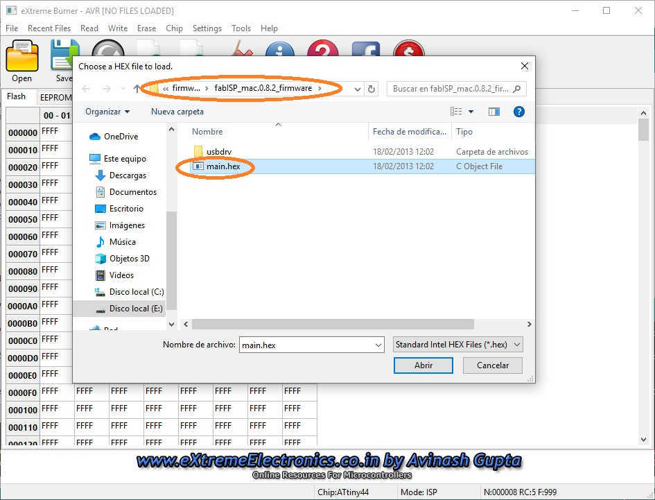 Afterwards, I choose the load option in File->Open Flash; it is to load the firmware to Attiny44; I explore the file to firmware path: