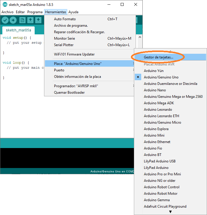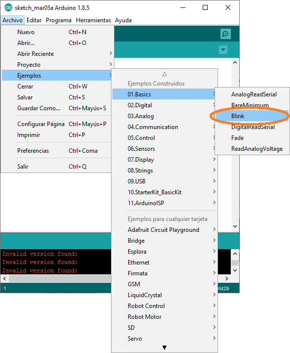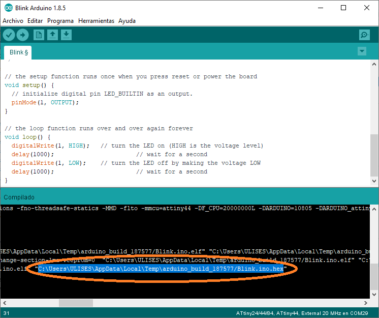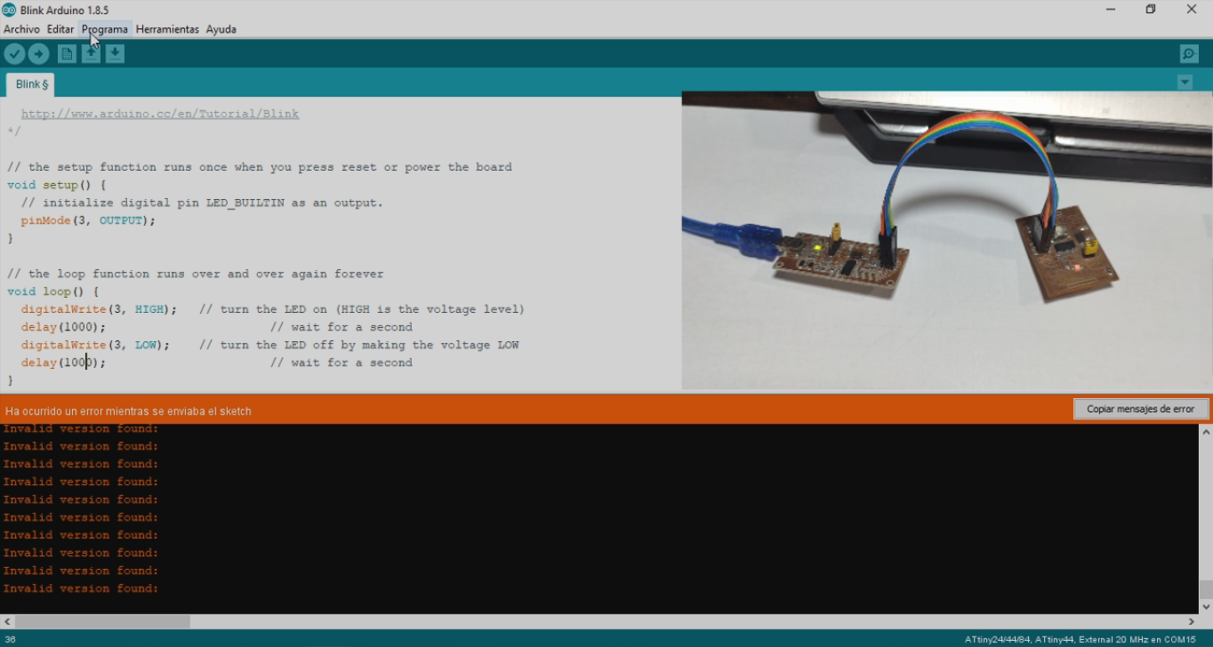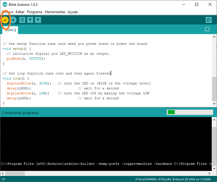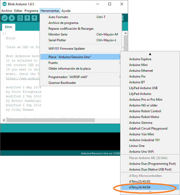 Now load the “Hello world” program to Attiny44A, open the Arduino and search in File/Examples/01.Basics/Blink