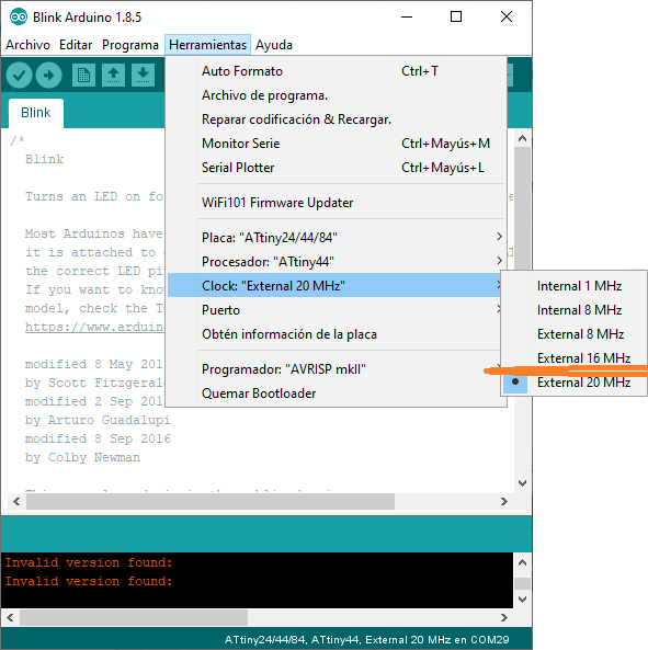 I choose in PROCESSOR the Attiny44 and CLOCK the external 20MHz
