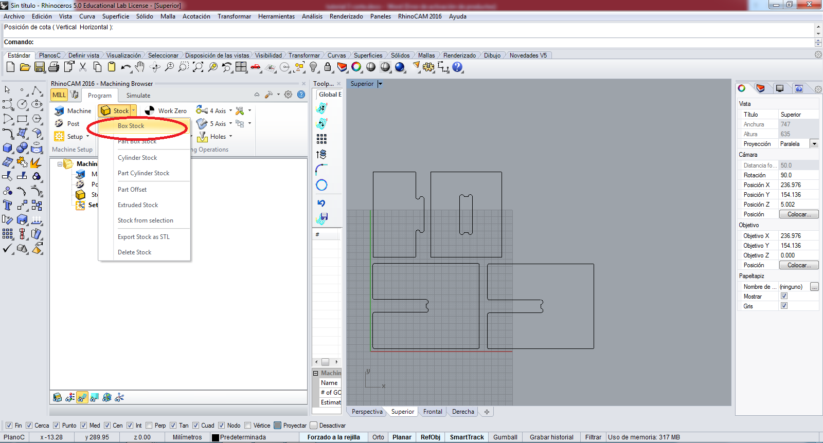 So I erased these parts and only I have the design pattern to cut, and to begin the configuration to cut, I click in Stock button and choose Box Stock: