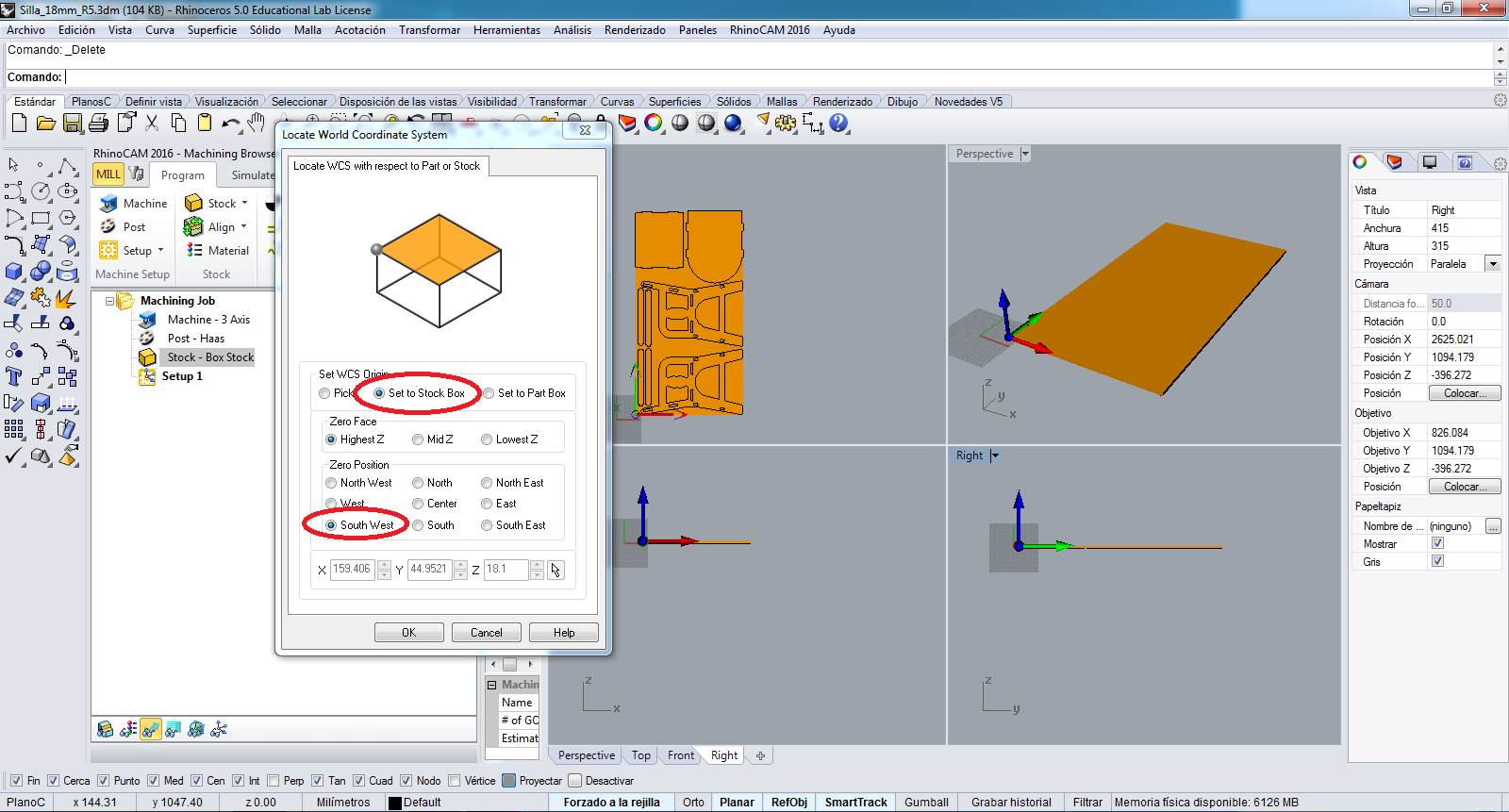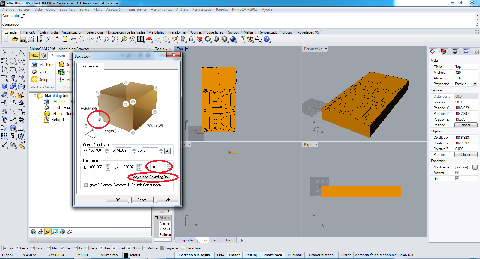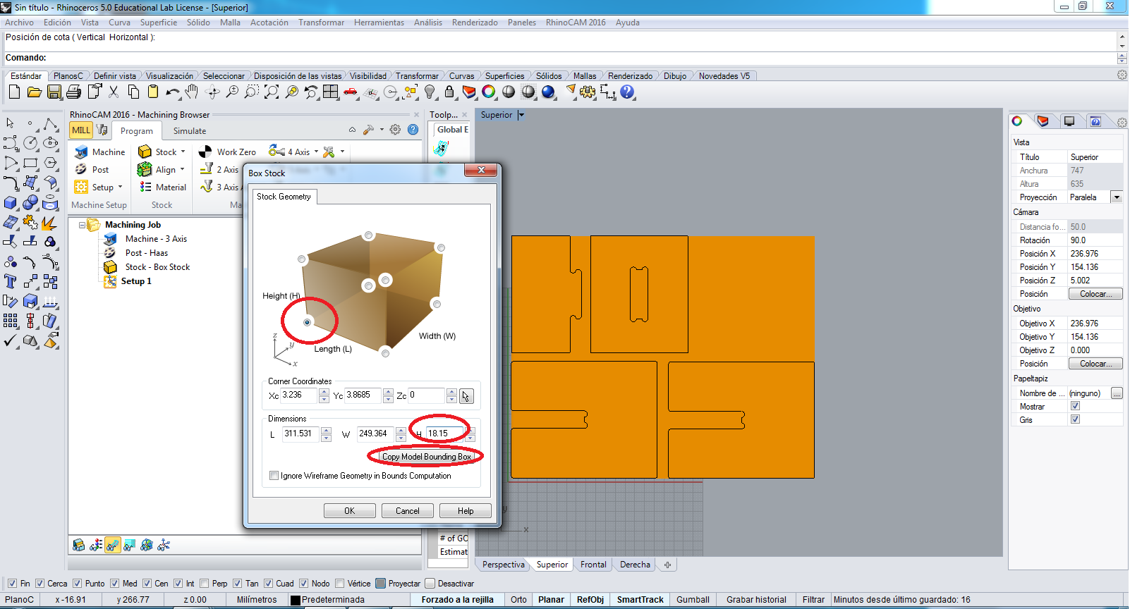 Now, I click in Copy Model Bounding Box button to copy the area to work, and I write the thickness in H, that is 18.15 mm in my case:
