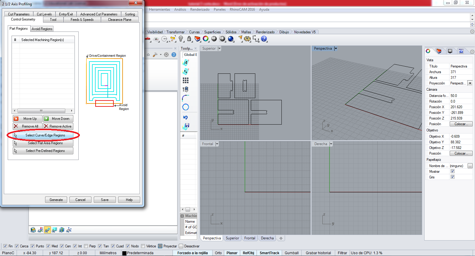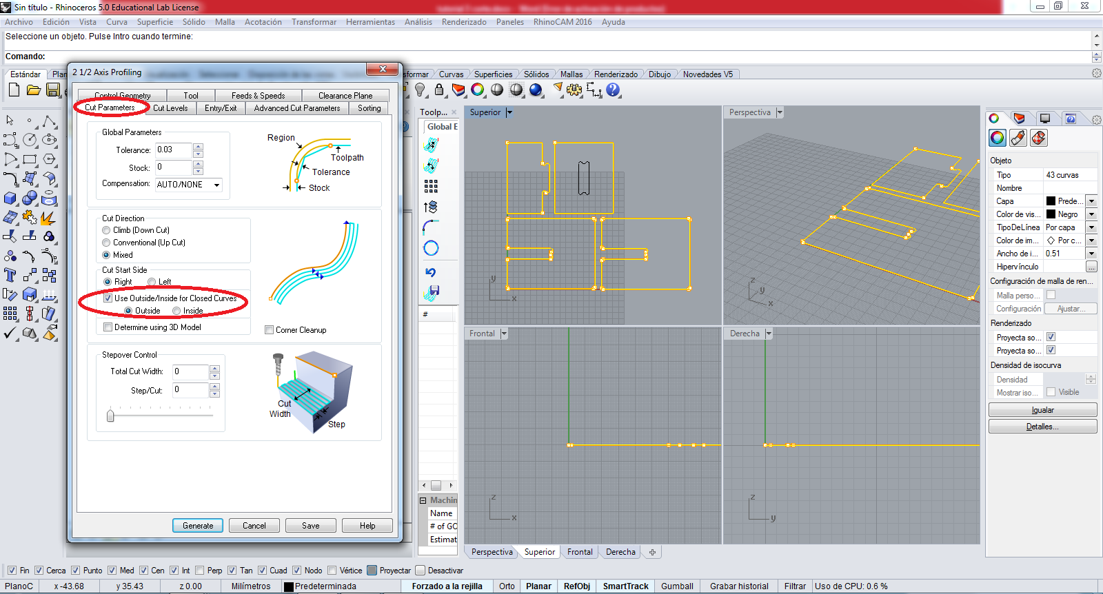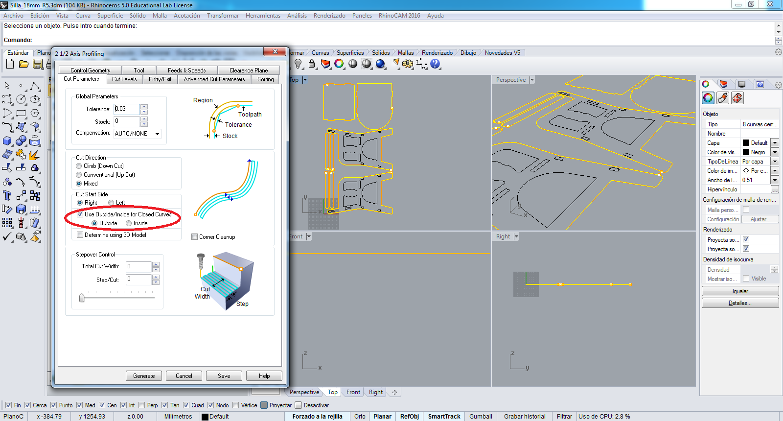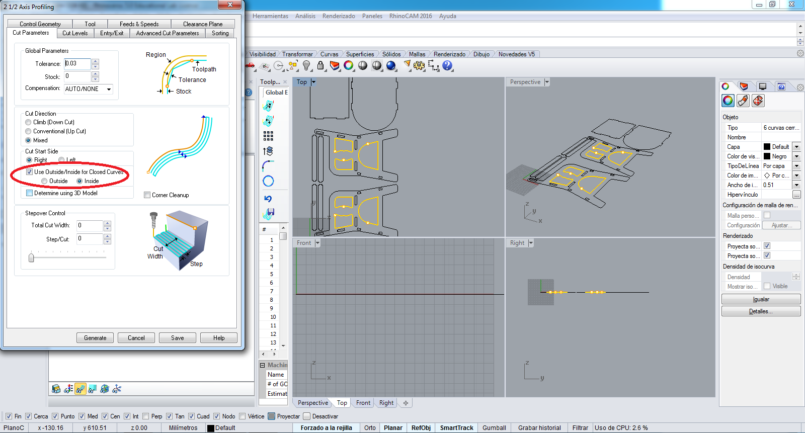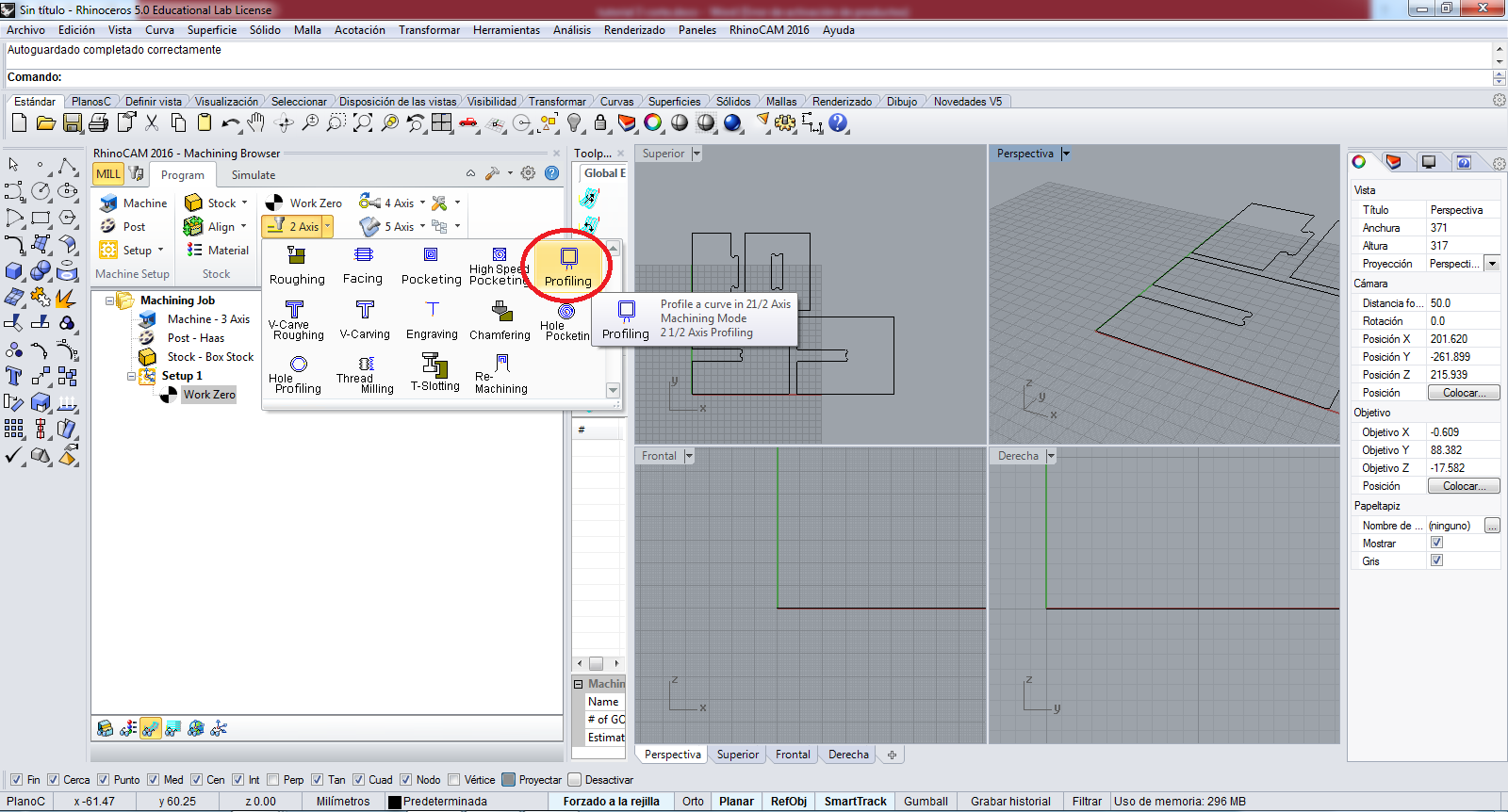 Now we are ready to generate the works, first I create the cutting work; I select in 2 Axis button the Profiling option: