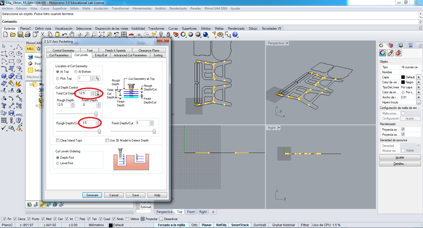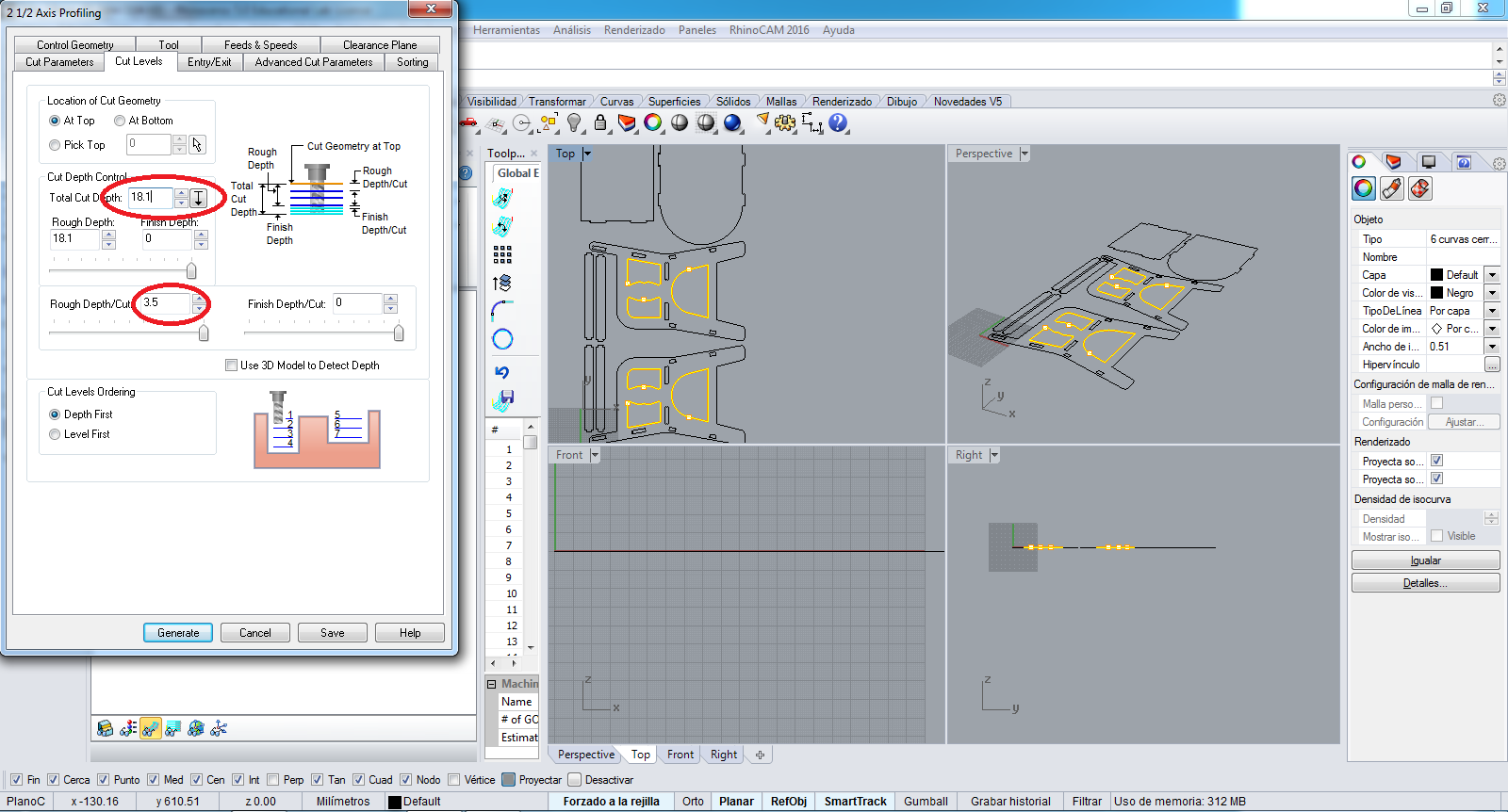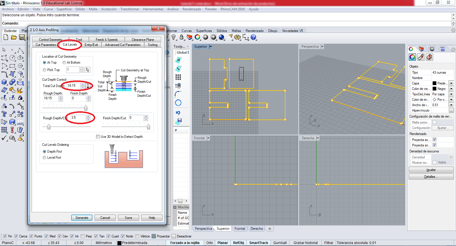 In the Cut Levels tab I colocate the thickness material of MDF and the cutting step, in my case is: