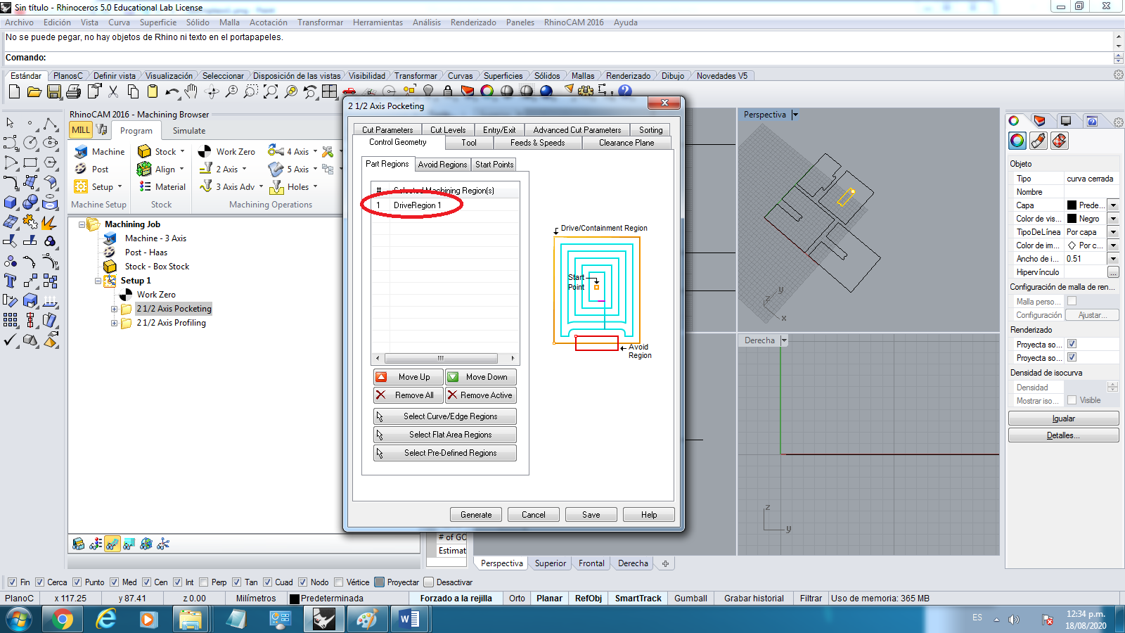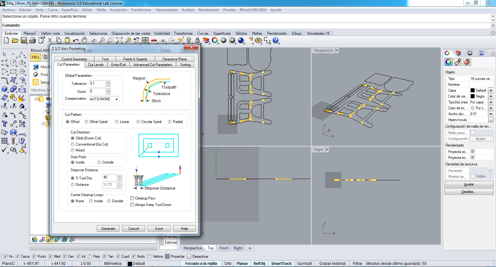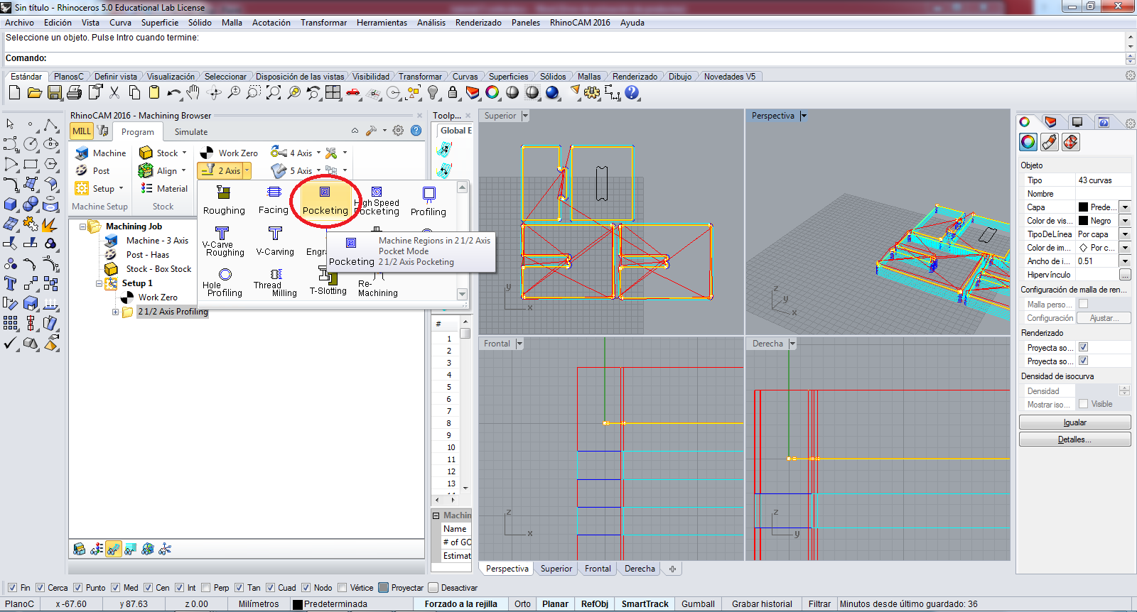 Now I create the Job to the POCKETING process, I select in 2 Axis button the Pocketing option
