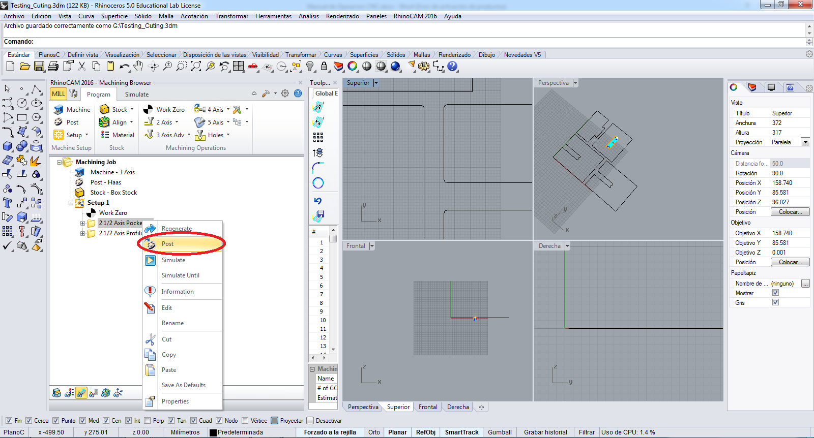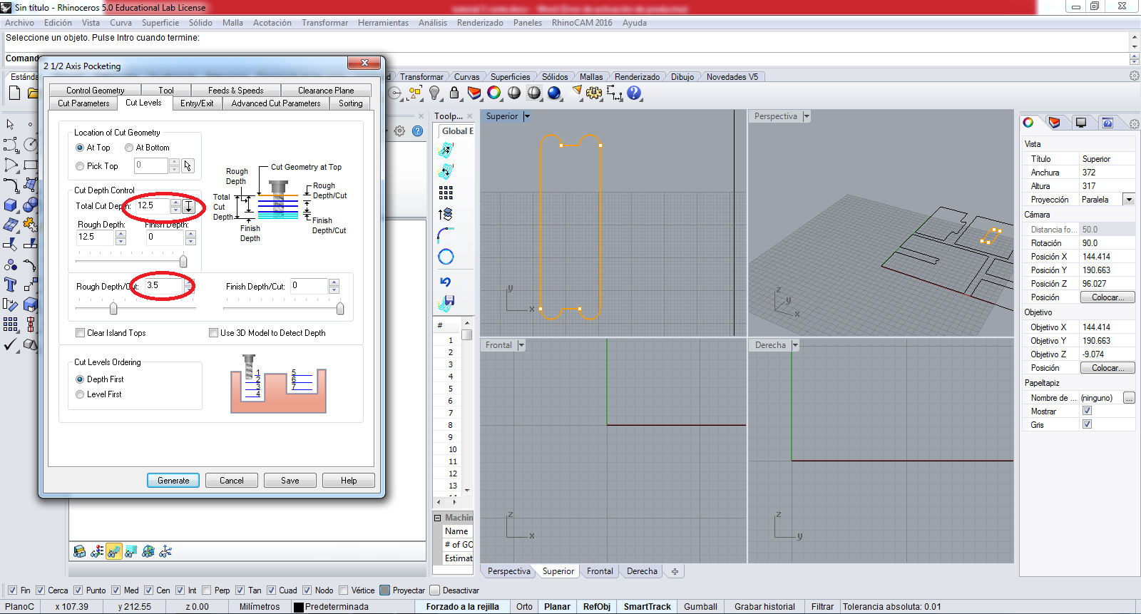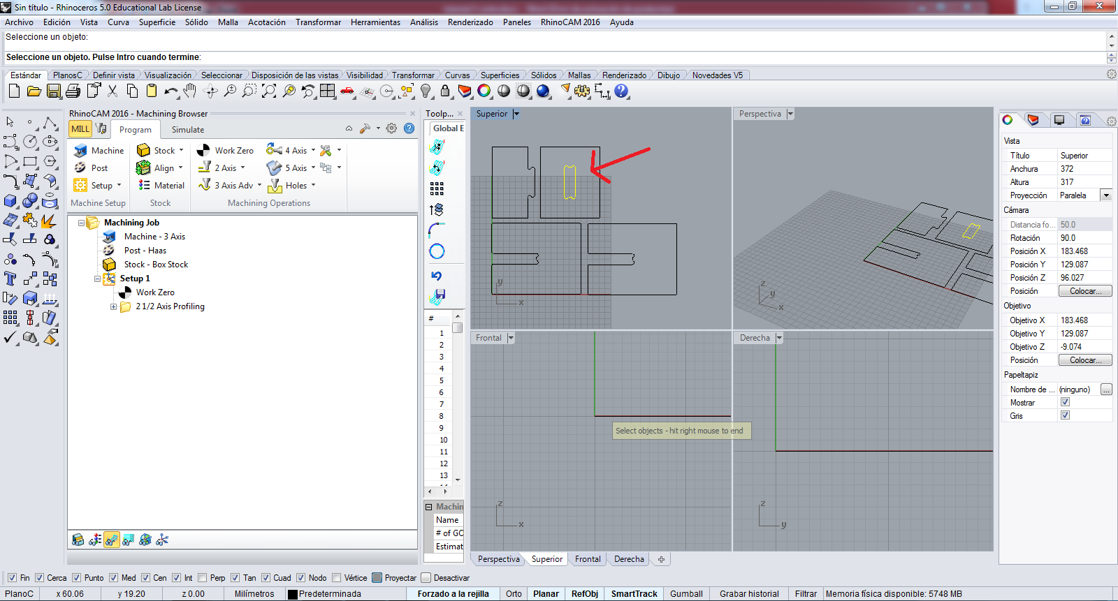 Now I create the Job to the POCKETING process, I select in 2 Axis button the Pocketing option