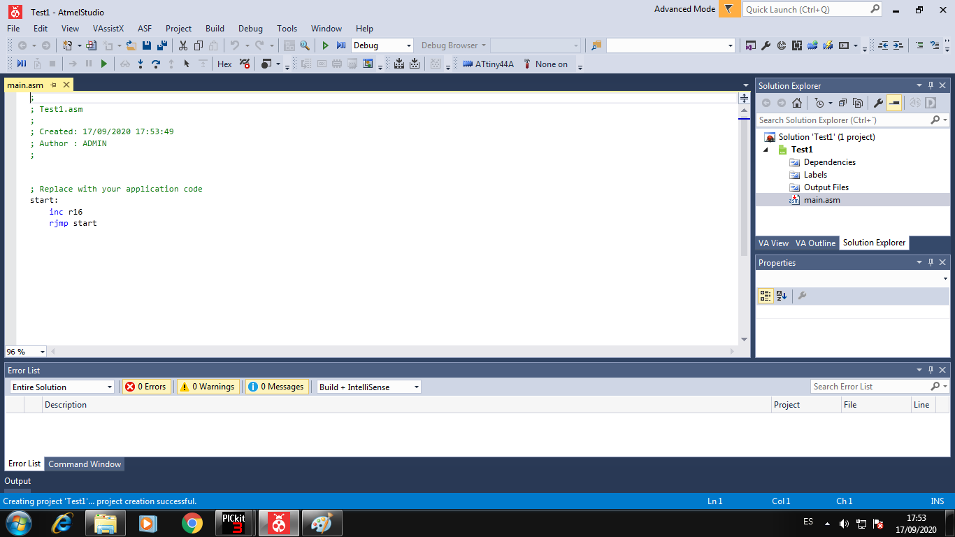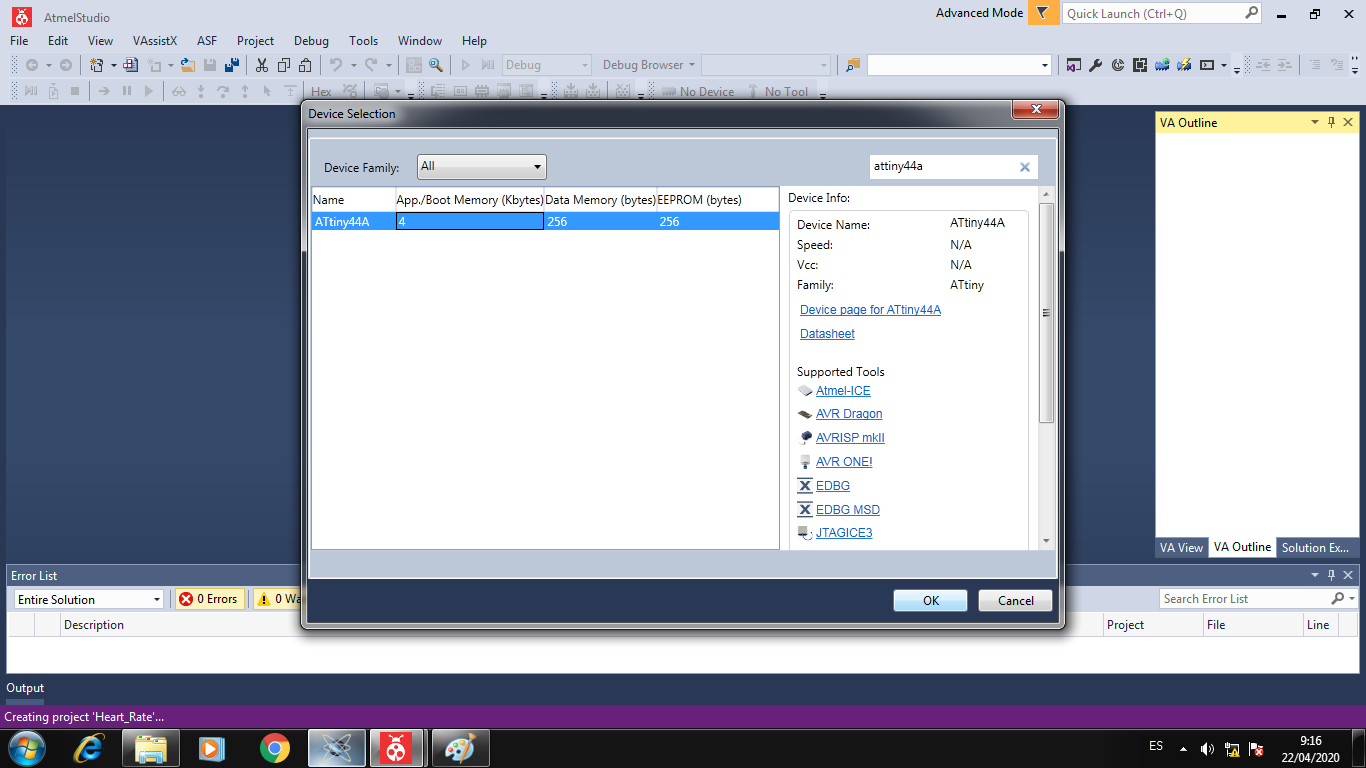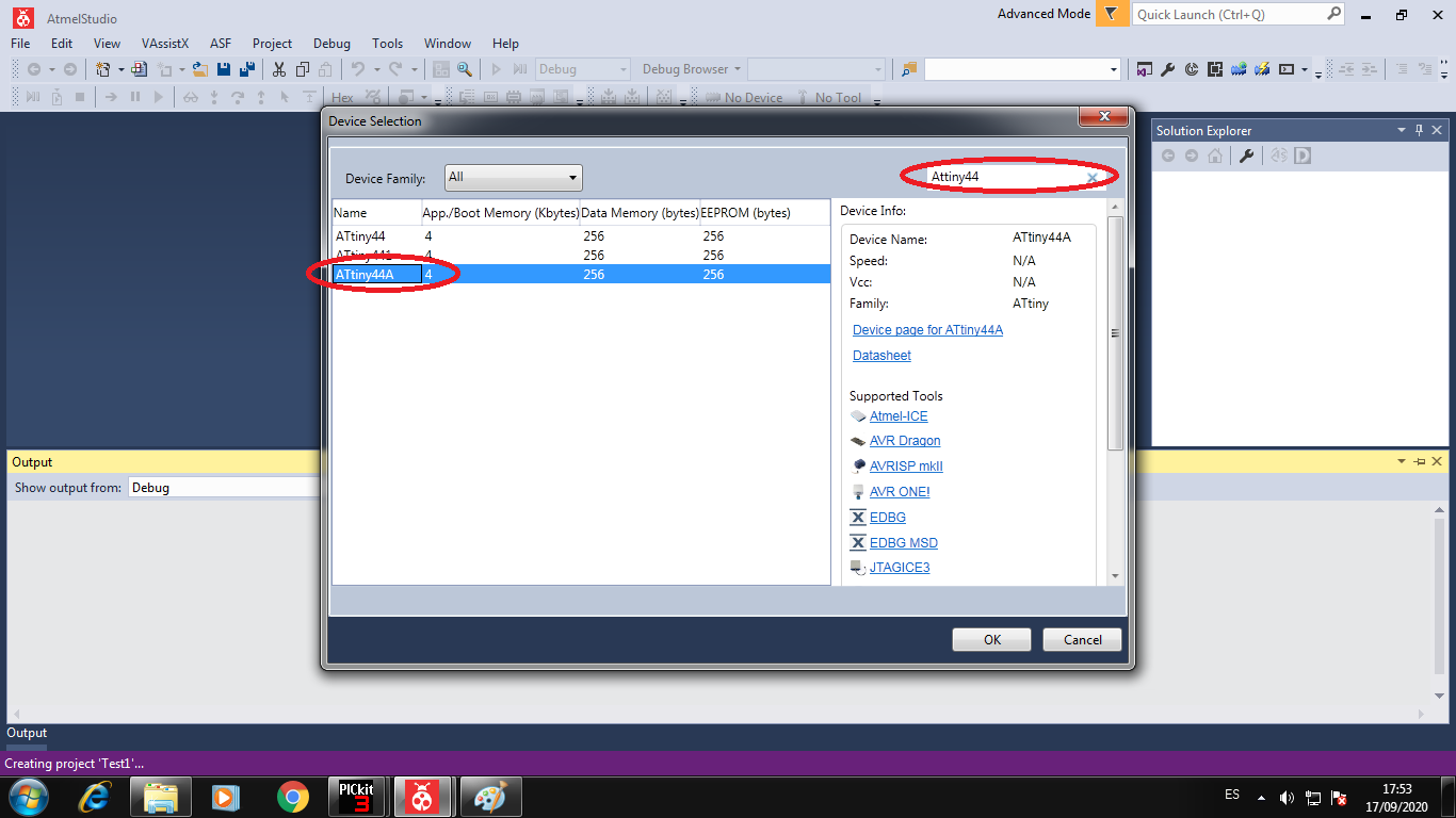 Choose the Attiny44A microcontroller in the search area, and click and OK button to create the project: