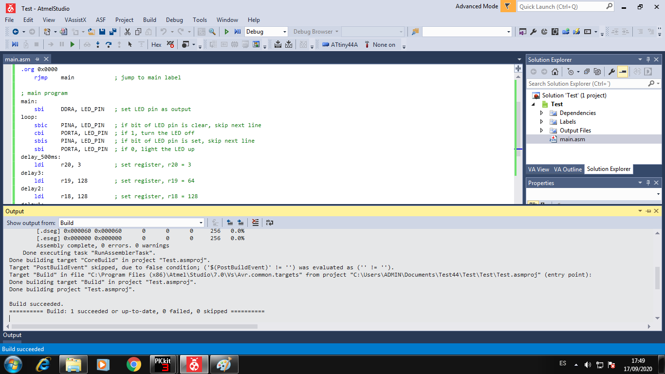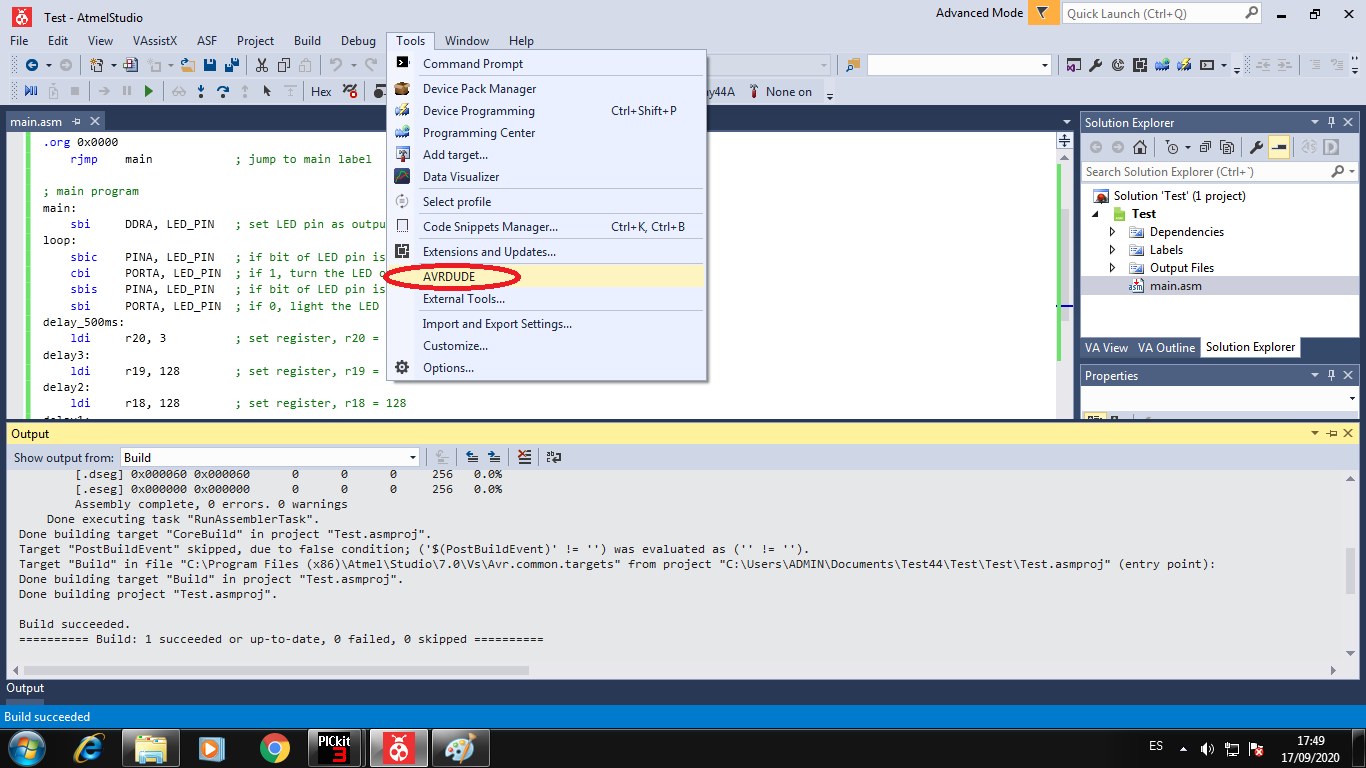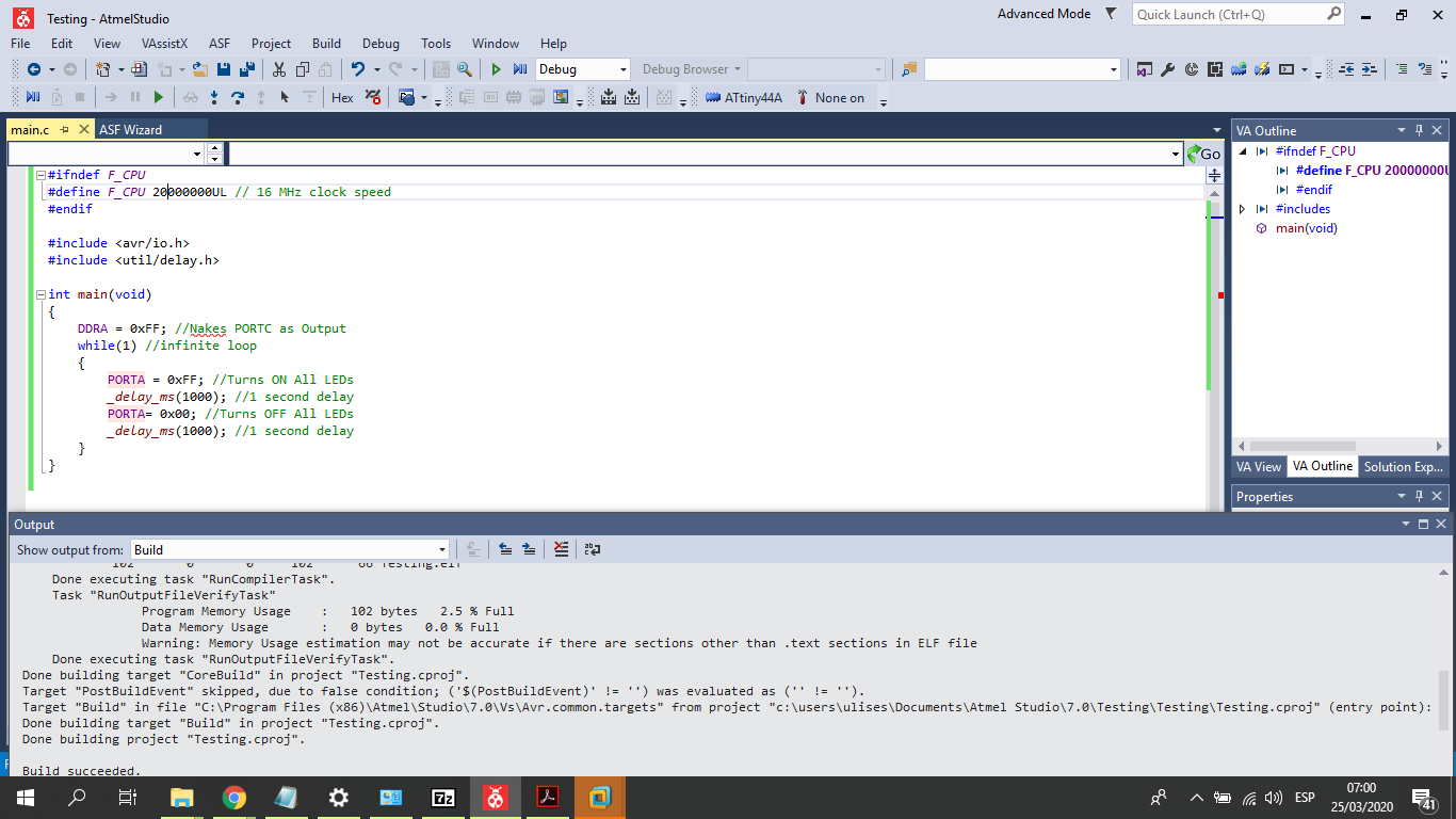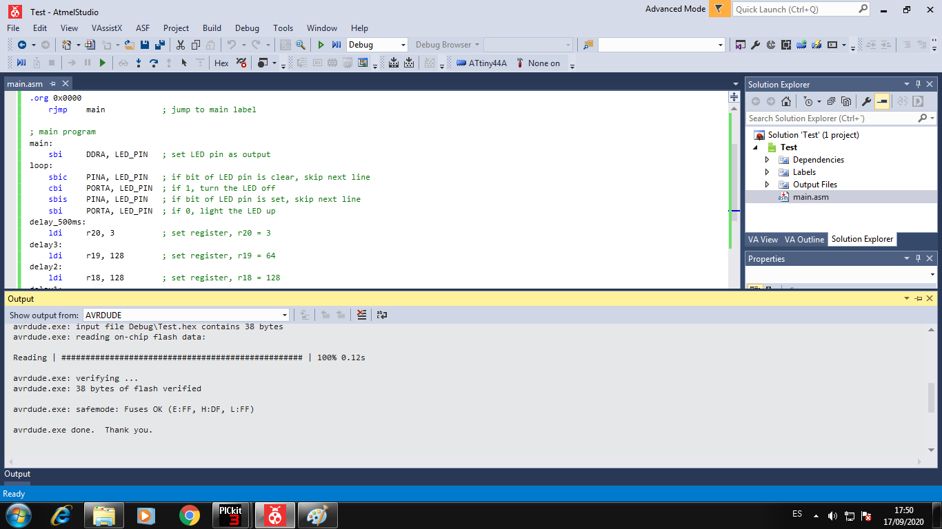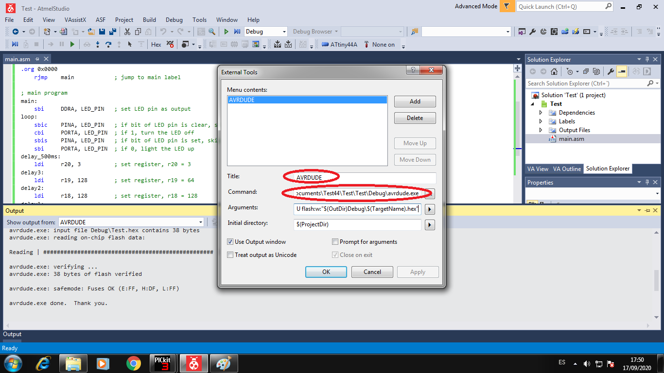 - Arguments: To program -> -C C:\Avrdude\avrdude.conf -v -p attiny44 -c usbtiny -U flash:w:”$(OutDir)Debug\$(TargetName).hex”:i